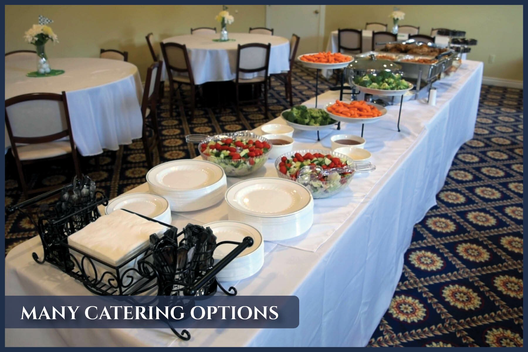 We understand the importance of thoughtful catering during gatherings and receptions. To accommodate your preferences, we offer a range of catering options, providing flexibility and choice for your convenience. We will assist with catering options, whether it will be our caterer or a caterer of your choice. Our catering choices include a variety of options including anything from simple hors d'oeuvres to a complete meal selection.